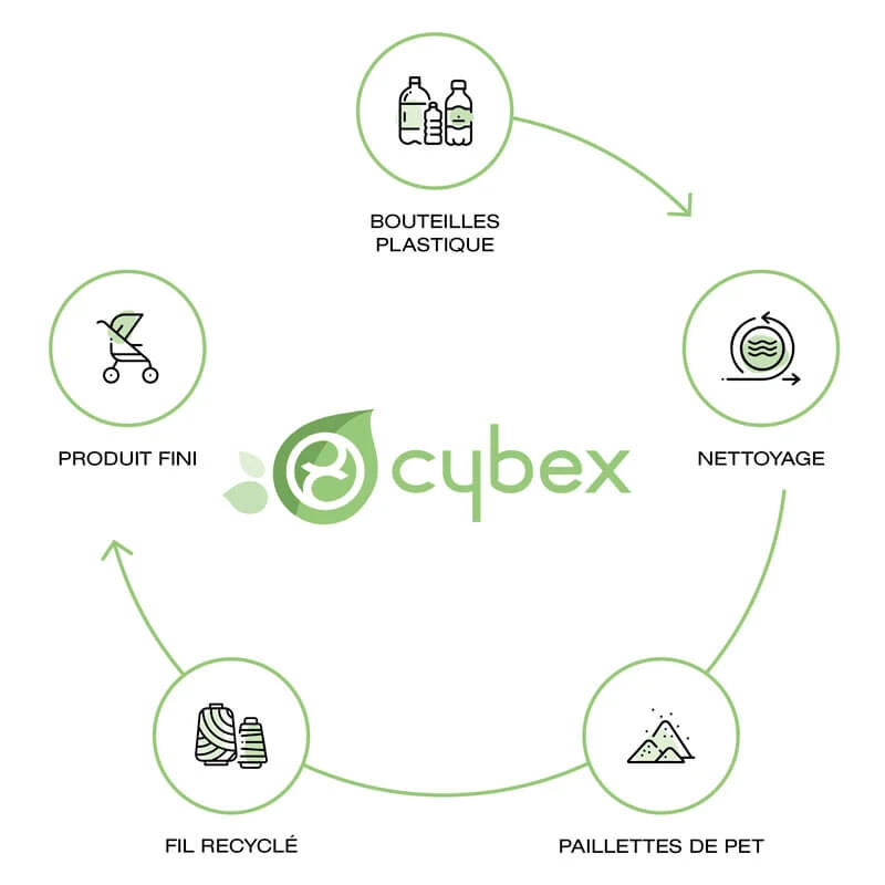- Le Green Leaf Cybex est un logo qui vise à mettre en avant les produits fabriqués à partir de matériaux recyclés.