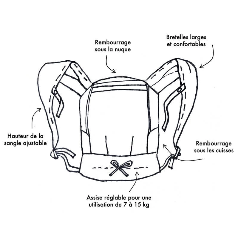 - Confortable : bretelles larges pour le porteur et rembourrage sous la nuque et les cuisses de l’enfant