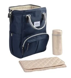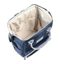 Le sac à langer Wellington Bleu marine intègre une pochette isotherme pour transporter les aliments de bébé, un tapis à langer nomade, ainsi que des attaches poussette compatibles à la plupart des modèles.