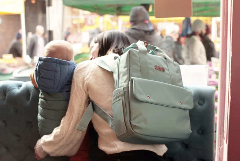 Le sac à dos à langer Georgi Eco Aqua de Babymel est conçu pour le déplacement aisé des affaires de bébé.